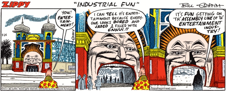 Amusement parks are framed as places where dreams can be fulfilled (I can fly! I can go to the moon!), but with their crowds, their noise, their bright lights, their looming structures (into the gaping mouth of the grinning monster!), their frenetic activity, they’re also nightmarish, and (as Zippy notes) they’re places where fun is totally commercialized, soullessly industrialized as a commodity.