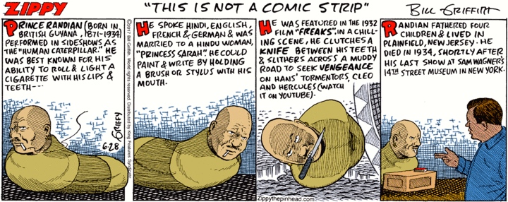 One in a long series of Zippy strips about Tod Browning’s film Freaks, the characters in it, and the actors who played them (only some of them posted about here). Also one in a long series of strips referring to the Magrittean disavowal, a contradiction between text and image: in this case, the title of this comic strip, This is not a comic strip.