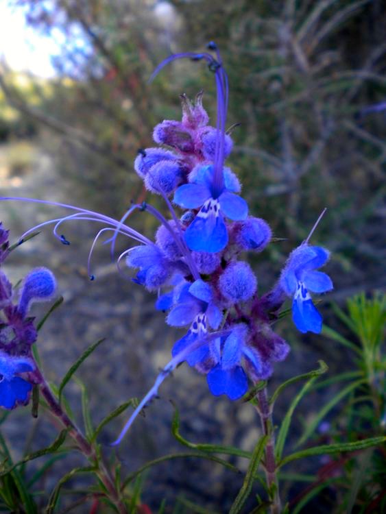 Trichostema lanatum is many-branched and grows to 1.5 m (5 ft) tall, with narrow, pointed green leaves. The smooth-petaled blue flowers are borne in dense clusters, with the stem and calyces covered in woolly hairs of blue, pink, or white.