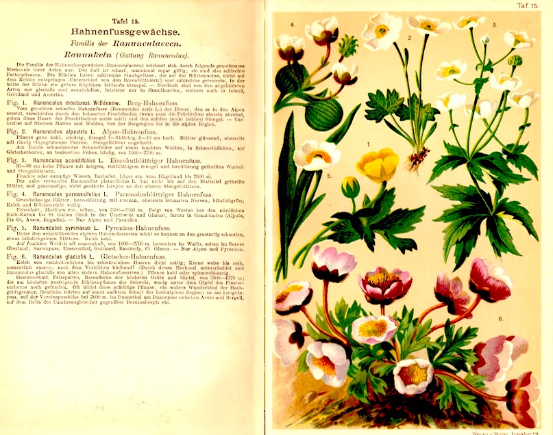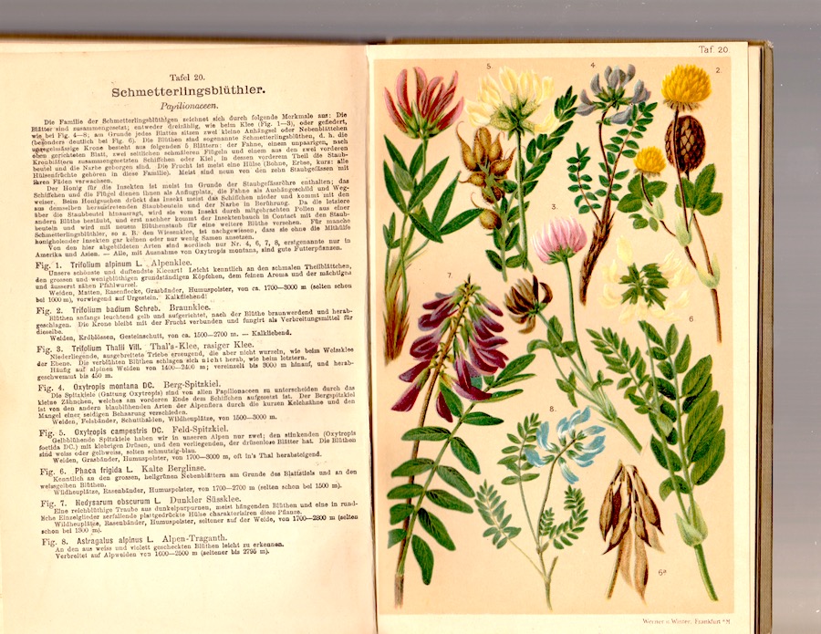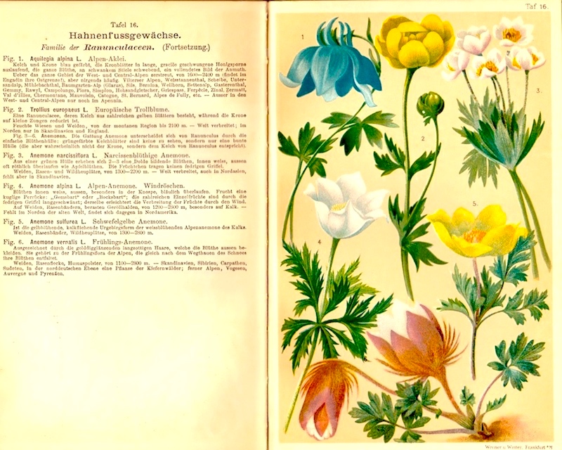 Return to the Alps. In a slowly unfolding series, more plates from the 19th-century botanical handbook Alpen-Flora (which my dad picked up on a visit to Switzerland in his 20s). The actual book title is Taschenflora des Alpen-Wanderers, listed as