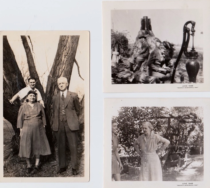 On the left (#1a): my dad, with his parents, Bertha and Melchior Zwicky, in April 1941 (on, I think, my grandparents’ farm in Sinking Spring PA, west of Reading). On the right, two photos from 1948, at my aunt Marian (Marian Rice Fries) and uncle Herb’s farm outside of New Smithville PA, west of Allentown. Top (#1b): Dad and his mother-in-law, Susannah Hershey Rice (called Sue). Bottom (#1c): Marian and Sue, her mother.
