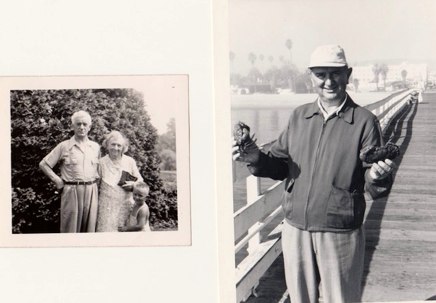 On the right, my dad on the pier at Goleta CA (next door to Santa Barbara), happily displaying some of the claws he and I have just extracted from crabs we caught. (Not dated, but some time in the 1970s.)