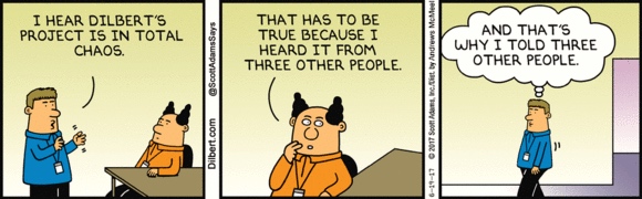 Today’s Dilbert, in which an unnamed employee goes to the pointy-haired boss to tell him that Dilbert’s project is in total chaos: