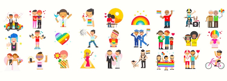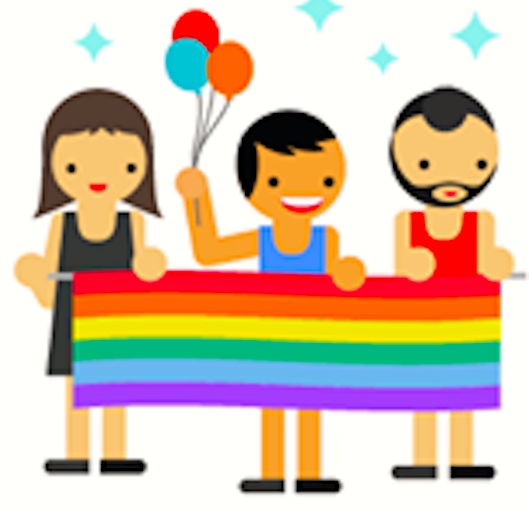 Ok, on the left, a woman, presumably representing the L of LGBT; on the right, a clone-type guy, representing the G of LGBT; in the middle, an epicene figure, representing the BT of LGBT. BT-person is nicely located between L and G, and in addition seems to be presented as biracial (also gets to hold the celebratory balloons: masculine blue and feminine red, plus orange).