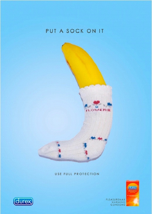 Some men think that wearing a c0ndom is like wearing a sock, but not with Durex … apparently. They are playing up on the fact that you can get full protection with the ultra slim Durex c0ndoms. It’s a great selling point, because men like to be able to feel with their banana.