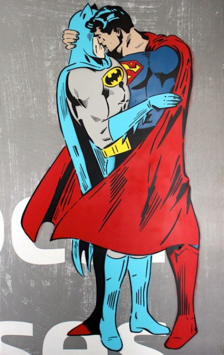 And in New York and London, from a Huffington Post piece on 4/4/16, “Superman And Batman Are Kissing For Equality In New York City: ‘I wanted to create a dialogue about equality by taking the two most alpha male superheroes and placing them in this embrace.'” by Chiara Piotto: