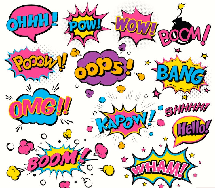 The piece has a Pop Art feel to it, thanks in part to “superhero bubbles” (or “explosion bubbles”) with KISS in them. An assortment of these bubbles: