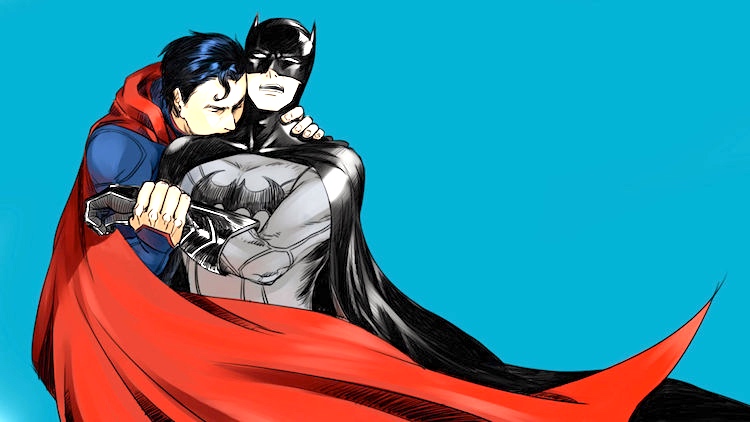 Batman and Superman, locking together, man to man: