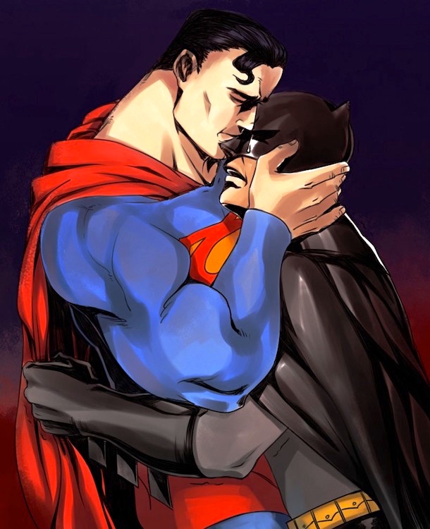 Image from my superhero-sex posting, which also has an erotic BatRobin slash image. Batman of the Gayverse is one randy superqueero, with a jones for any hunk in a cape. But Superman is his great antagonist, his great ally, and his great love.