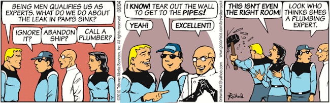 Back in the Brewster Rockit world, Capt. Rockit and his guys are also given to manfixing — “I’ll fix that for you, ma’am” — as in this 8/4/14 strip: