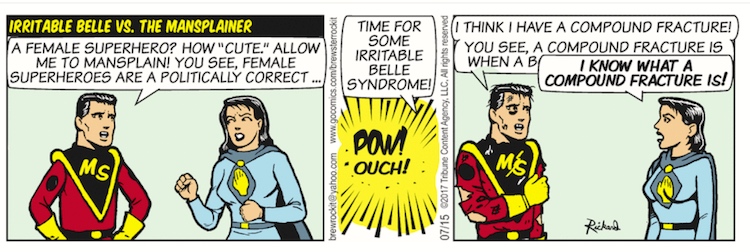 From David Preston, yesterday’s Brewster Rockit comic strip, in which a male character attempts to mansplain mansplaining to Pamela Mae Snap (aka Irritable Belle):