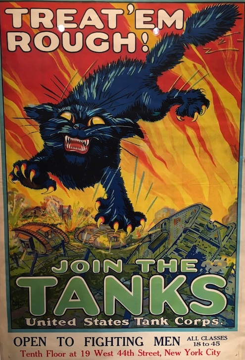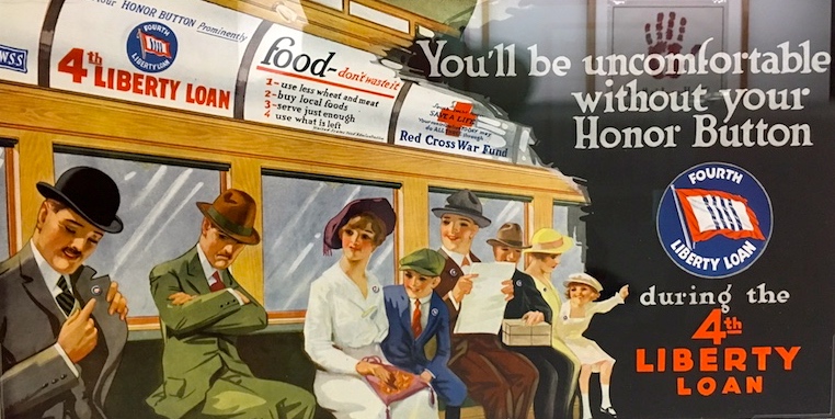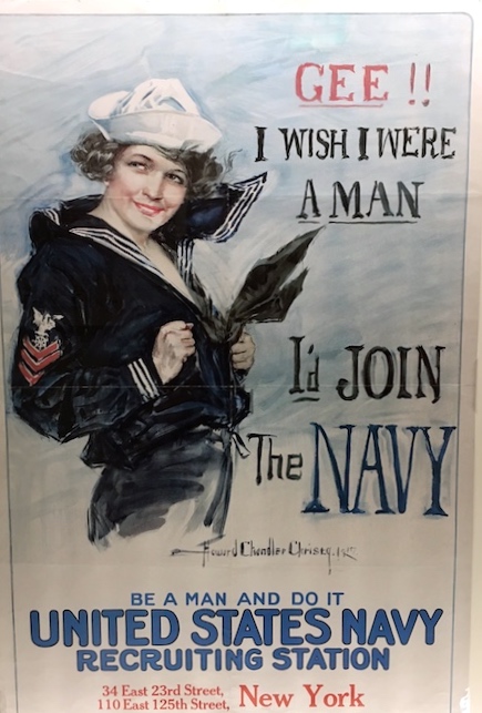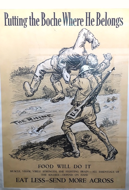 On to poster images from the show, which I’ll group into four big topical categories: recruitment, bonds, food, and women’s support. Some posters are keyed to the artist (JMF for James Montgomery Flagg, JCL for J. C. Leyendecker, HCC for Howard Chandler Christy); and three posters with notably phallic imagery are asterisked.
