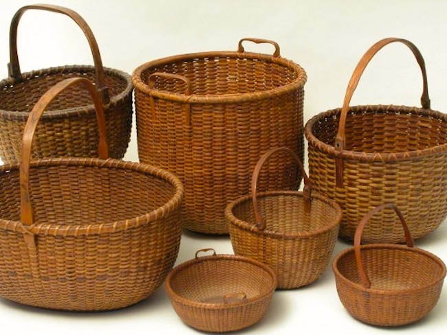 The single handle, the shallow cavity, and the shape (oblong or rectangular rather than circular) seem to be crucial to the uses trugs are put to. These 19th-century Nantucket Baskets (made of woven wicker) are lovely, but only the one on the lower left might pass as a trug: