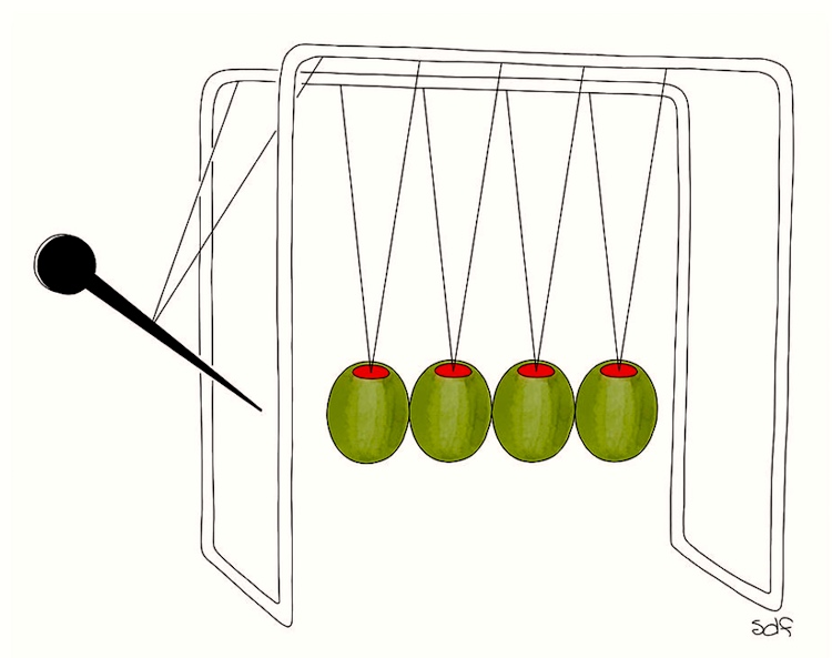 Most of sdf’s cartoons are wordless, and most are black & white; they all have clean, crisp lines. They also all convey a strong sense of the absurd, often by combining images from different conceptual domains. As in #4, which combines cocktail olives (with the cocktail pick for eating them) and the Newton’s cradle device. From Wikipedia: