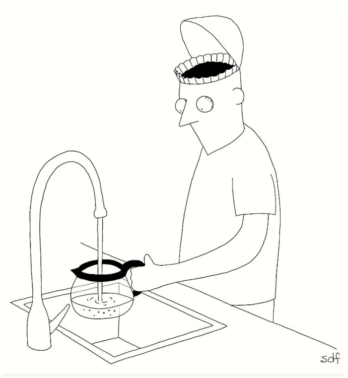 The coffeepot. In #2 the guy is filling a glass pot with water. Bizarrely, the guy has no mouth, and the top of his head has been opened to reveal, not brains, but a white fluted material holding a dark substance. This is just incomprehensibly weird (rather than amusing) unless you recognize the pot, the fluted material, and the dark material as three components of a drip coffeemaker: the pot that supplies water and also holds brewed coffee; a paper filter; and ground coffee beans. From Wikipedia: