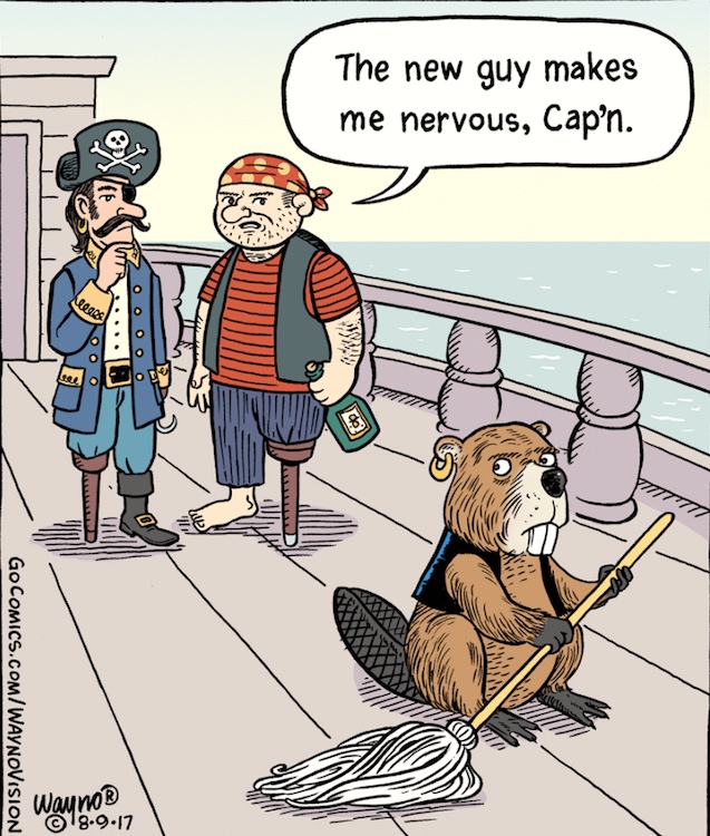 The character on the right is a pirate deckhand (signaled by the gold earring and leather vest), swabbing the deck. But of course you must also recognize that this hand is a beaver (note, among other things, the brown fur, the teeth, and the big flat tail). That’s absurd, and therefore at least worth a chuckle.