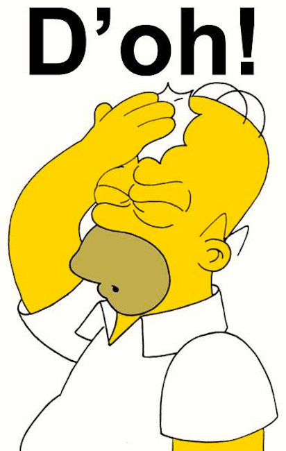 “D’oh!” … is a catchphrase used by the fictional character Homer Simpson, from the long-running American animated sitcom The Simpsons (1989–present). It is typically used when Homer injures himself, realizes that he has done something stupid, or when something bad has happened or is about to happen to him. All his prominent blood relations — son Bart, daughters Lisa and Maggie, his father, his mother and half-brother — have also been heard to use it themselves in similar circumstances. On a few occasions Homer’s wife Marge and even non-related characters such as Mr. Burns and Sideshow Bob have also used this phrase.