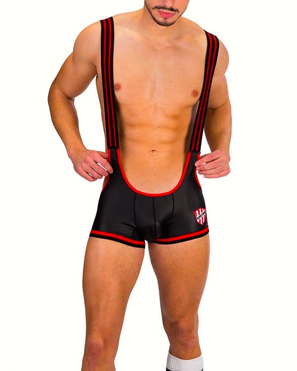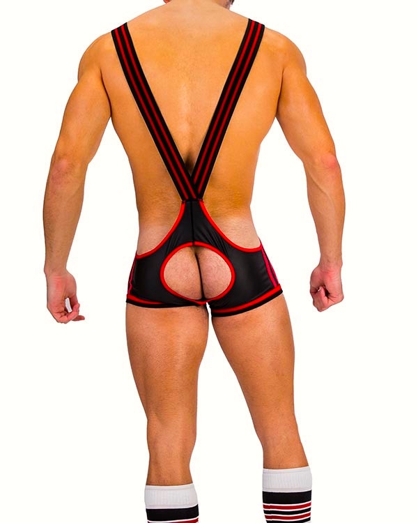 Slanting towards the fetish side is the bluntly named Bang Singlet (in black), displayed here front and rear: