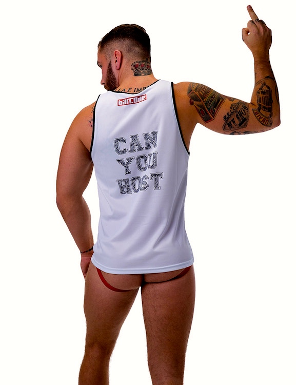 Salem Beiruti. Enough of the gay 90s, back to Barcode Berlin, now with its studiedly outrageous Can You Host tank top, with a design by Madrid conceptual artist Salem Beiruti. Front and rear: