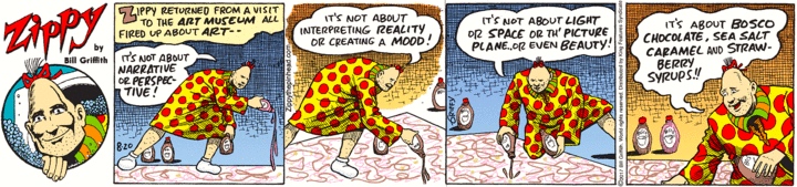 The first two panels of #1 reproduce #2 and #3, with Zippy in place of Pollack and a bottle of Bosco in place of a can of paint.