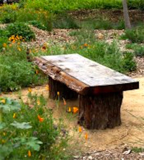 The Lucie Stern Demonstration Garden. The Palo Alto city demonstration garden, at the Lucie Stern Community Center, adjacent to the Girl Scout House at 1120 Hopkins Ave. The garden is small, only about 20 ft square, and carefully labeled, with an on-line plant finder, but some of the labels have been removed (probably by children) and some plants (including several very striking ones now in bloom) seem not yet to have been labeled and are not identified on-line. A bench for refection in the middle of the garden plot:
