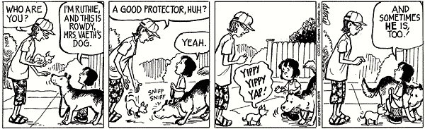 The woman with the little yappy dog offers Ruthie a casual-speech reduced question, here just a NP a good protector, plus an assent particle. Unfortunately, the reduction introduces a multiplicity of interpretations that would otherwise not be present: the unreduced form could be Is he a good protector? (the woman’s intention) or Are you a good protector? (what Ruthie understands, given her knowledge of the dog and his proclivities) or various other possibilities, like Do you want a good protector?.