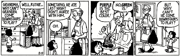The verb agree that Ruthie has in mind is a reciprocal verb, denoting a relationship R1 between two people α and β, in which α and β have the same opinion on some matter, so that if α agrees with β, then (ceteris paribus) β agrees with α and (again, ceteris paribus) α and β agree. Ruthie then understands her grandmother to be treating the referent of something he [Ruthie’s grandfather, person β] ate last night as a person α and is saying that R1 doesn’t hold between α and β — the scene Ruthie imagines in the third panel of the cartoon, in which α and β disagree, hold different opinions, as to which color is the best.