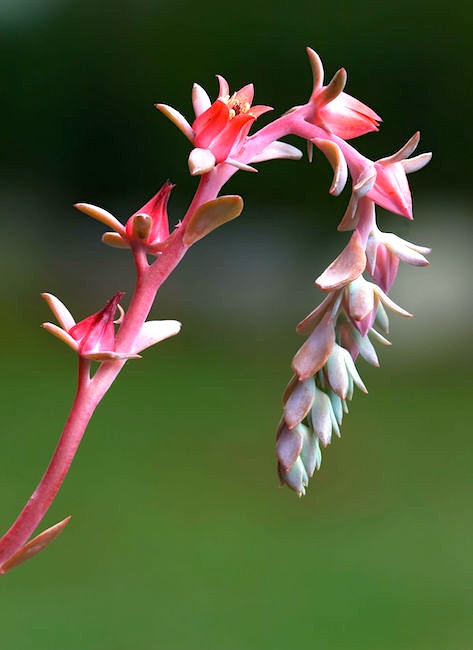 Echeveria ‘Blue Curls’ is a mostly solitary succulent [in thefamily Crassulaceae] with rosettes to 12 inches (30 cm) in diameter, with frilly-edged aqua blue-green leaves that take on showy pink hues in spring and fall. The flowers are reddish-pink in color, well spaced along long stalks in summer.