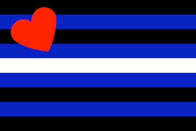 (#7) Nine horizontal stripes of equal width. From the top and from the bottom, the stripes alternate black and royal blue. The central stripe is white. In the upper left quadrant of the flag is a large red heart.