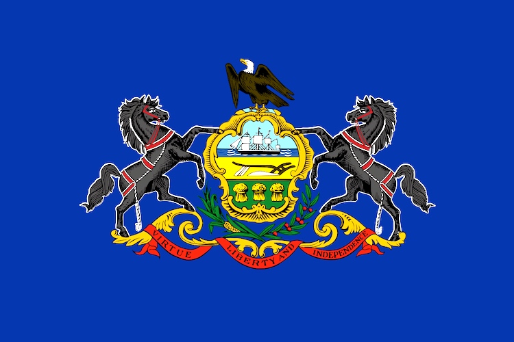 The coat of arms of Pennsylvania is an official emblem of the state, alongside the seal and state flag, and was adopted in 1778. The flag of the Commonwealth of Pennsylvania consists of a blue field on which the state coat of arms is embroidered. The Pennsylvania coat of arms features a shield crested by an American bald eagle, flanked by horses, and adorned with symbols of Pennsylvania’s strengths — a ship carrying state commerce to all parts of the world; a clay-red plough, a symbol of Pennsylvania’s rich natural resources; and three golden sheaves of wheat, representing fertile fields and Pennsylvania’s wealth of human thought and action. An olive branch and cornstalk cross limbs beneath—symbols of peace and prosperity. The state motto, “Virtue, Liberty and Independence”, appears festooned below. Atop the coat of arms is a bald eagle, representing Pennsylvania’s loyalty to the United States.