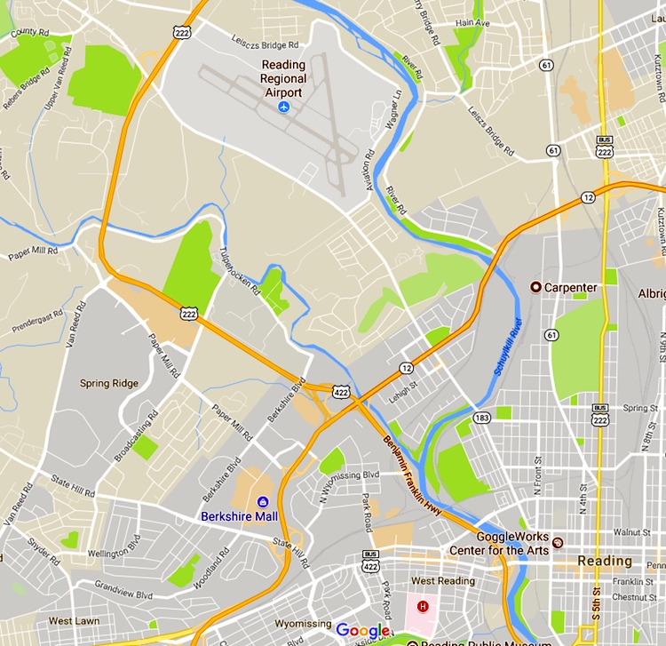 My first childhood house was roughly at the N of the legend West Lawn in the lower left corner. My second was northeast of there, across Grandview Blvd., almost to State Hill Rd. From there the trip to the airport was across fields (now all built up) and then through lots of woods. A grand adventure for a 10 to 14-year-old. (There were other bicycle adventures: to the south, as far as Shillington; to the west, as far as Wernersville; and once, about 30 miles northeast to Allentown.)