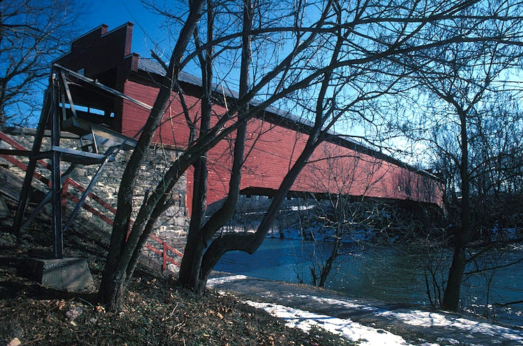 The bridge is a 204-foot-long (62 m), Burr Truss bridge, constructed in 1867. It crosses the Tulpehocken Creek. It serves as the walkway entrance to the Berks County Heritage Center, which also includes the Gruber Wagon Works. It is one of five covered bridges remaining in Berks County. It is the largest single-span covered bridge in Pennsylvania.