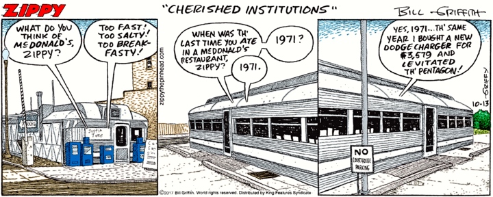 If I remember correctly, the last time I ate at a McDonald’s was 1988, and that was at the insistence of a friend (who was fond of the place). Before that, sometime around 1970. I’m with Zippy here.