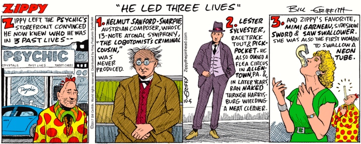 The first two are probably inventions of Bill Griffith’s, though the details of their lives in the strip might well be distant allusions to real things, and there have certainly been men named Lester Sylvester (though none, I think, with associations to cons, flea circuses, or Allentown PA). But Mimi Garneau is solid. From the American Sideshow Blow-Off site on 7/13/06: