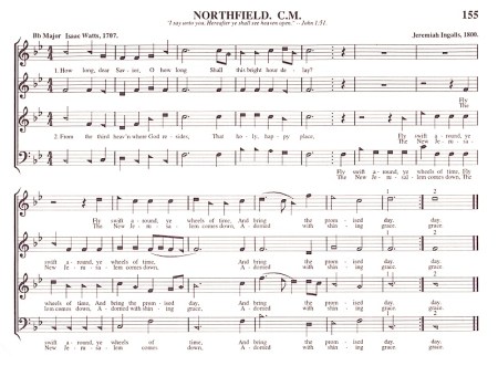 Northfield 155 (in the 1991 Denson revision of the Sacred Harp) by Jeremiah Ingalls; text (by Isaac Watts) “How long, dear Savior, O how long”