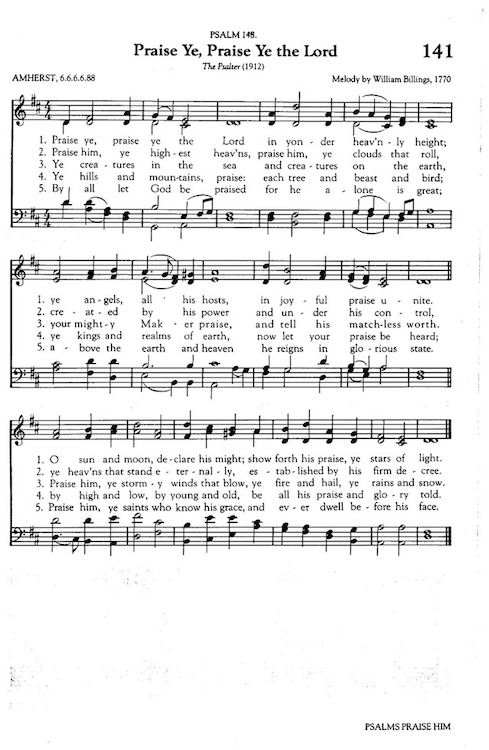 (#8) Amherst by William Billings; to various texts, incl. “Praise ye, praise ye the Lord” (Trinity Hymnal), above; also “Ye boundless realms of joy” (Common Praise) and “Lord of the worlds above” (Isaac Watts, in Southern Harmony)