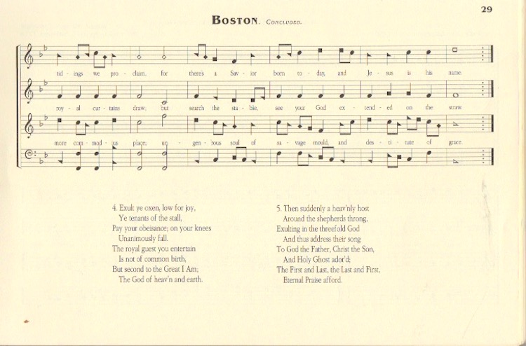 On to William Billings: Amherst (a roundnote setting with standard SATB voicing), Greenfield (a roundnote setting, but with shapenote voicing, with the melody line in the tenor), and Boston (from Karen E. Willard’s 1994 Sacred Harp hymnbook An American Christmas Harp, hereafter ACH).