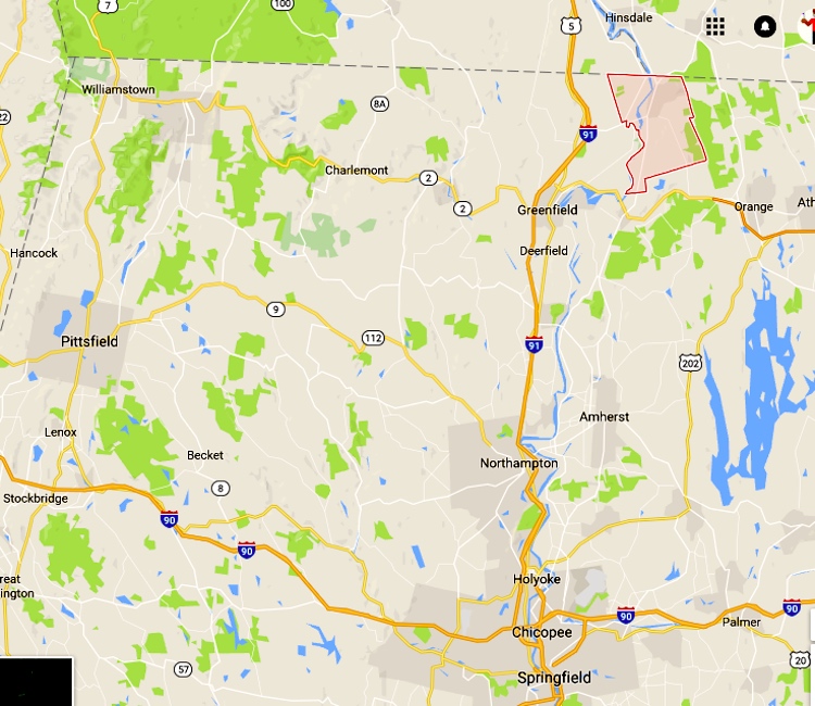 … Northfield is located at the junction of the Massachusetts, New Hampshire and Vermont state borders along the Connecticut River. The town center is located 12 miles (19 km) northeast of Greenfield, 44 miles (71 km) north of Springfield, 52 miles (84 km) northwest of Worcester and 84 miles (135 km) west-northwest of Boston.