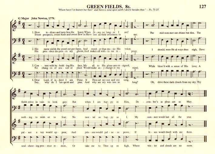 (#6) Green Fields (sometimes called Greenfield) 127; tune not attributed; text (by John Newton) “How tedious and tasteless the hours”