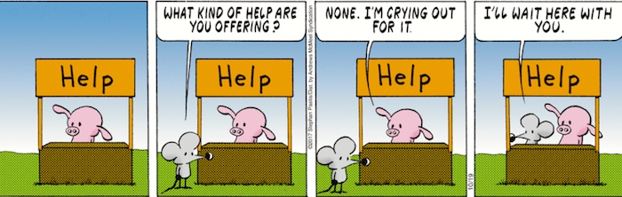 So #1 has two characters behaving in ways that elicit sympathy for their plight: Pig is believable as a character in need of help, but he corresponds to Lucy as a provider of help, who’s not. Charlie Brown is believable as a prospective client who sympathetically joins someone in need of help, but in #1 he’s played by Rat, who’s not. We need to see the two participants in #1 as representatives of a pairing of two sympathetic characters; on FB, Priya K suggested that #1 is “a quiet Calvin & Hobbes sentiment in a Peanuts schtick with a Pearls twist and characters”, and that sounds just right to me: the little boy and his stuffed tiger, together against the world.