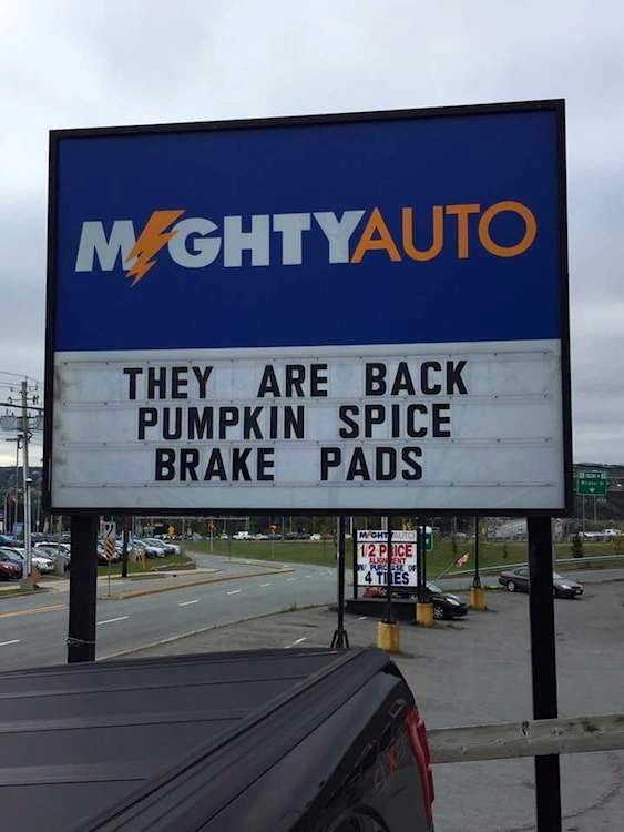 Other advertising uses of pumpkin spice are playful, but represent actual offers — in particular, Mighty Auto’s fall specials, which I’ll get in a moment. First, some music.