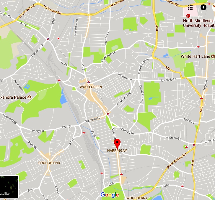Harringay is a district of north London, England, within the London Borough of Haringey. Harringay’s main shopping street, Green Lanes, is a busy, cosmopolitan high street. Some shops have a long established presence, like Disney’s furniture store, which has traded there since 1913. Others reflect the more cosmopolitan nature of Green Lanes and include a large number of Kurdish & Turkish bakeries, grocers, cafes and a growing cluster of restaurants. [Almost a quarter of the district is open space; Finsbury Park (the green area at the bottom of the map) is officially part of Harringay.]
