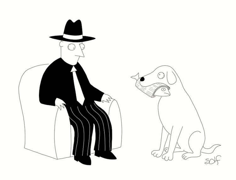 #1: it’s all about the fish. To understand sdf’s cartoon, you need to know (on the left side of the cartoon) something about the stereotypes of the Sicilian mafia in the US, starting with the figure of the mob boss in this context, the mafia don, and his characteristic costume, exemplified in detail in #1. And then (on the right side of the cartoon) you need to know that the newspaper-fetching dog is a staple of pop-cultural representations of Anglo (US and British) lower-middle class life. (I have never experienced a newspaper-fetching dog in real life, but I recognize the cultural motif.)