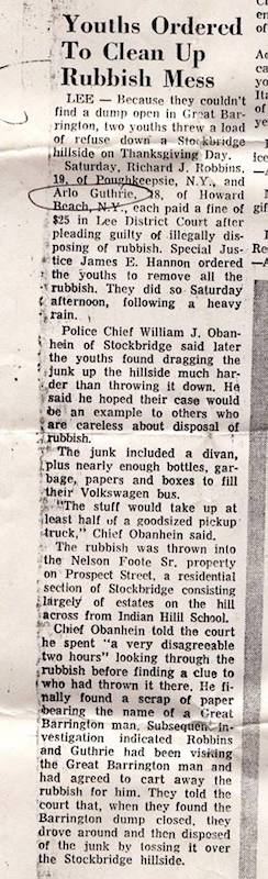52 years ago (Nov. 29, 1965) the Berkshire Eagle printed a little article about two young men being fined 25 bucks for dumping trash. Little did we know at the time that the incident, which ran on page 25, would become the basis for Arlo Guthrie’s Alice’s Restaurant. Here’s our original story from 1965: