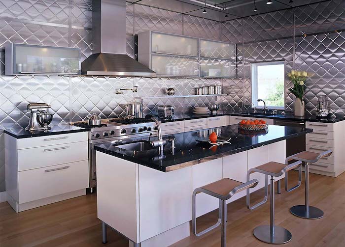 Quilted steel. Quilted stainless steel walls make a diner look sleek, shiny, and modern(e). Not just diners. From the BusyBoo site on 5/14/14, “San Francisco Designer Showcase Kitchen: Quilted Kitchen” by Denise Hopkins, quoted here in full so you can appreciate the build-up to the last, quilted, paragraph: