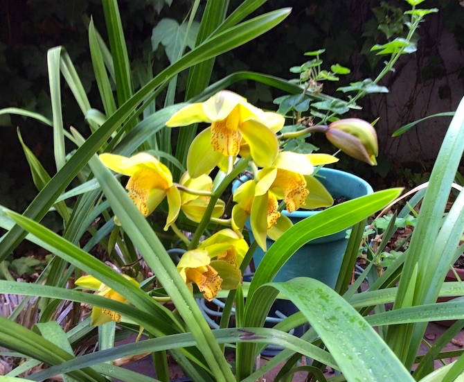 Starting in May, we had a series of extraordinary heat waves, with record-breaking high temperatures again and again (sometimes 10 degrees F. above the record for the day). Then the heat waves broke and temperatures dropped by about 40 degrees, to something like normal. This seems to have convinced winter-blooming plants, like my cymbidium orchids, that winter had come, so they started sending up flower shoots. By Halloween, about six weeks early, we had this: