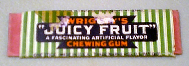 A 1946 Juicy Fruit wrapper, touting the fascinations of its artificial flavoring: