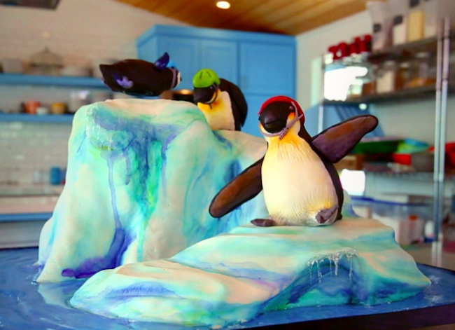 The spinning, or flying, penguin cake. From Kim Darnell, a link to a brief Food Network video about making this composition of iceberg, two big edible penguins, and a small spinning penguin (which must be eaten with care, since it has a magnet inside):