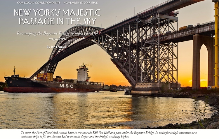From Mike Pope on Facebook a few days ago, this excerpt from Ian Frazier’s “New York’s Majestic Passage in the Sky: Revamping the Bayonne Bridge to make space for megaships” in the 11/13/17 New Yorker: