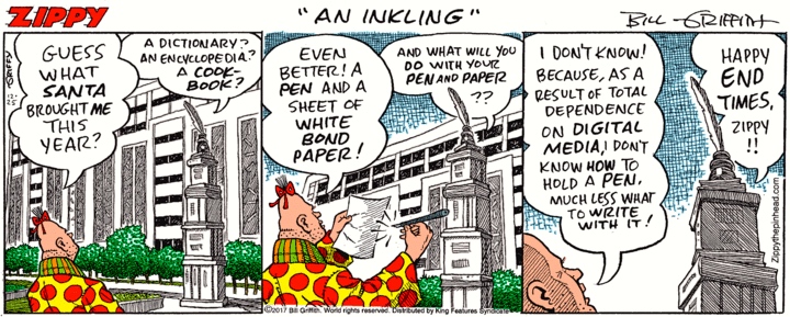 Zippy continues his visit to North Carolina — yesterday Salisbury, today Charlotte — with Xmas pleasure and puzzlement about the antique technologies of pen and paper: